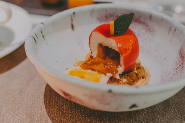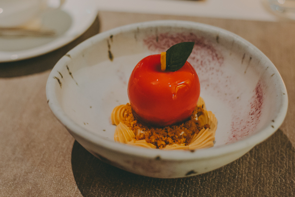 コースの最後を飾るのは、「ネオ・アップルパイ」とも呼べるりんごの特製デザート、その名も「タルトタタンの再構築」。香ばしく焼き上げたクランブルとナッツを混ぜ込んだメレンゲアイス、さくさくのタルト生地の上に、つややかなリンゴ型のムースが鎮座します。その中にはコンフィチュール状のリンゴが忍ばせてあり、ナイフを入れると、とろりと甘酸っぱい果肉があふれ出す・・・! サクサク、ふわふわ、とろり、と食感のグラデーションも楽しく、最後の一口まで余韻をゆっくり楽しみました♡