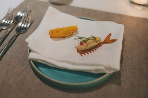 まずはフランス・アルザスのスパークリングで乾杯。キリッとドライな飲み口ながら、花を思わせる上品な香りと余韻があり、一杯目から気分が高まります。アミューズは2品で、左はチョリソーを練り込んだ一口サイズのマドレーヌ。マドレーヌと言っても甘さはほとんどなく、ほんのりスパイシーな大人の味でした。右は「お魚の骨」に見立てたサクサクの生地に、サーモンのリエット(バターやクリームと合わせたフランス風ペースト)をのせたもの。指でつまんでひと口でぱくっといけて、泡との相性も抜群です。