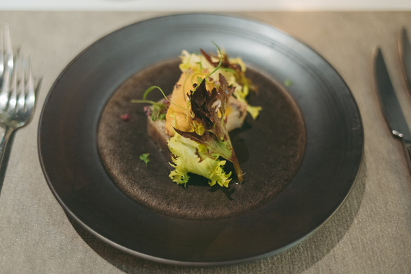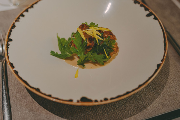 続いて登場したのは、「鮟鱇のテリーヌ 濃厚な肝のムース」。あんこうを丸ごと丁寧に煮出してとった出汁に、低温でやわらかく火入れした皮や身を合わせて冷やし固めたテリーヌは、日本の煮凝りのようなビジュアル。その上には、裏漉ししたあん肝にバターとクリームを合わせた濃厚なムースがふんわり。ひと口頬張ると、あん肝が舌の上でとろけ、後からじんわりと出汁の旨みが追いかけてくる・・・! 添えられたフェンネルの花がほのかなハーブの香りで味わいに立体感をプラスし、こんな繊細な料理食べたことない・・・!と大感動。冬の海の恵みを余すことなく楽しめる前菜でした。