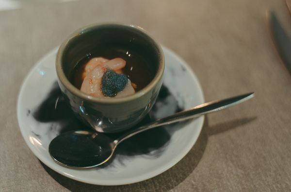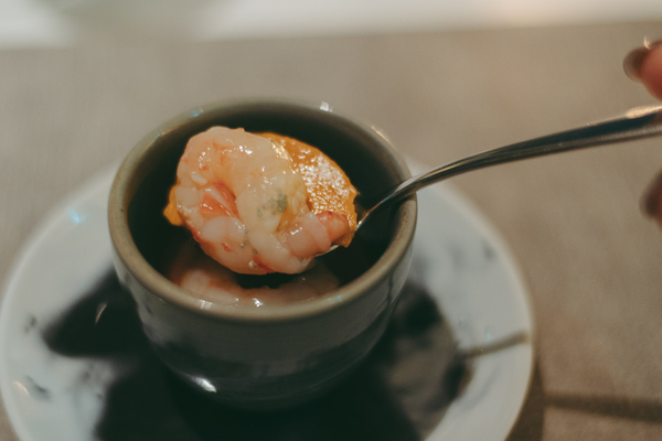 お次は見た目も華やかな「北海道産甘海老のマリネ 海老のコンソメ」。底には、洋風茶碗蒸しのようななめらかなエビのフランが敷かれ、そこに香り高い海老のコンソメゼリーがとろりと重ねられています。スプーンで下からすくい上げると、異なる3層が一度に口の中で重なり合い、凝縮された旨みに思わず悶絶・・・!