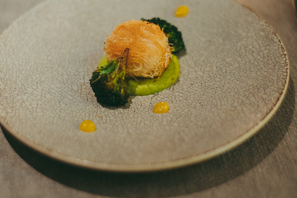 魚料理の前半を飾るのは「カダイフを纏った帆立貝のムニエル ブロッコリーのクーリー」。カダイフとは、極細の麺状にした生地をこんがり揚げ焼きした生地で、サクサクとした軽い食感が特徴なんだとか。ひと口かじると、外側はカリッと香ばしく、中の帆立は中心がほんのりレア。ぷりっとした食感とともに、帆立本来の甘みがじゅわっと広がります♡ そこに寄り添うのが、ブロッコリーをなめらかなピュレ状に仕立てたクーリー。さらに、お皿の周りにちょんちょんと添えられたマイヤーレモンのコンフィチュール(柑橘のジャム)が名脇役。やさしい甘みと爽やかな酸味がアクセントとなり、一口ごとに表情が変わる奥行きのある味わいでした。