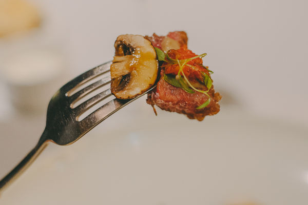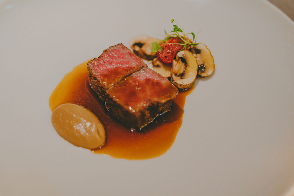 メインのお肉は「TOKYOCOWBOY 特選和牛サーロインのグリル ソース・シャスール」。TOKYOCOWBOYは、東京・用賀発のオーダーカットで和牛を提供する精肉店。高温のグリルで香ばしく焼き上げたサーロインは、断面が美しい朱色でサシが綺麗に入っていて、見るからに美味しそう・・・。ひと口頬張れば、香ばしさの後にしっとりとした肉汁と和牛ならではの甘みがじんわり。重くなりすぎない絶妙な脂のノリで、「もう一切れ…」とついフォークが進んでしまう危険な美味しさです。ソースはフランスの定番“ソース・シャスール”を分解して表現したもの。通常はキノコ、トマト、エシャロット、白ワインなどを煮込んで仕上げるソースですが、今回は牛の出汁のソース、香り高いキノコ、ドライトマトのコンフィそれぞれを別々に配置。これらをお皿の上で混ぜ合わせることで、口の中でソース・シャスールが「完成する」という一皿。ここまで、レベルが高すぎるシェフの遊び心に翻弄されっぱなしです。