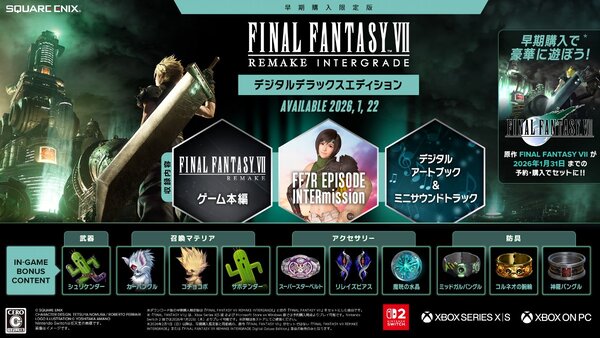 また、Xbox Series X|S/PC(Windows)版では予約後すぐに『ファイナルファンタジーVII』をダウンロード・プレイできる。Nintendo Switch 2版では発売日である2026年1月22日よりプレイ可能だ。このお得な機会に、リメイク作品とその原点となる物語の両方を、あわせて楽しんでみてはいかがだろうか。