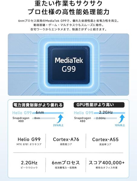 11型Android タブレット「T8015」のCPUにはMediaTek G99(6nmプロセス)を採用。AnTuTuベンチマークでは40万点前後のスコアで、日常用途を快適にこなす性能です。