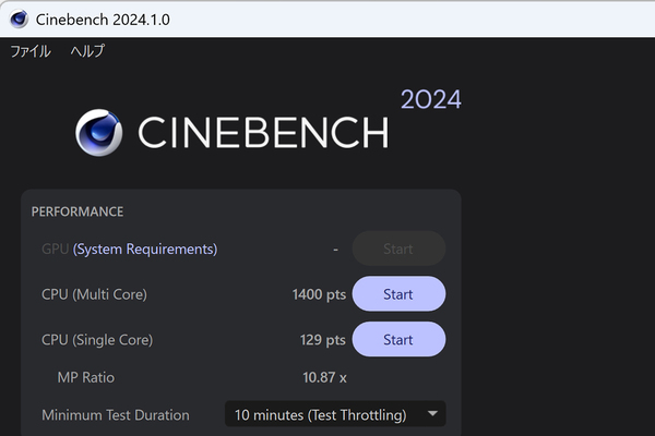 CPUパフォーマンスのひとつの指標となるCGレンダリング系ベンチマーク「Cinebench 2024」のスコアを確認すると、Multi Core 1400 pts、Single Core 129 ptsを記録した。