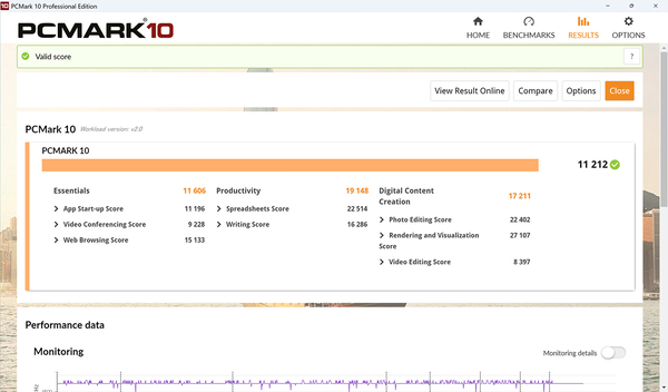 PC全体のパフォーマンスを確認できる「PCMark10」を実行すると、総合スコアは、高スコアになっている。