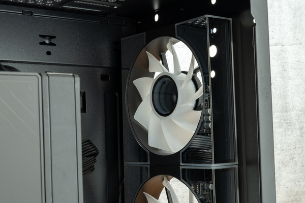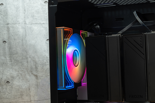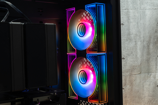 ディスプレー横に、少々斜めに置くことで映えるように選んだのが、フレームと軸部分にインフィニティミラーを搭載したアドレサブルRGB LEDファンのdarkFlash「DM8」だ。ファン固定穴が片側にしかないため、フロントにはリバースタイプを2基搭載している。リアファンと合わせて、PC内部をド派手に彩る。
