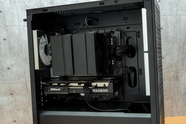 そのほか、電源ユニットにはコスト重視で容量750WのASRock「PRO-750B」、PCケースにCooler Master「Elite 302 Lite」、ケースファンに手ごろな価格ながらド派手なLEDイルミネーションを楽しめるdarkFlash「DM8」シリーズを3基追加している。