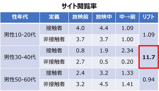 上記の分析を性別で分けると男性の検索行動が高く、特にワード検索率の年代別では、男性30-40代で5.50倍のリフト値、男性50-60代で3.77倍、男性10-20代で1.49倍と、全ての年代で顕著に効果が見られました。サイト閲覧率も同様に、男性30-40代で大幅なリフト値となり、検索行動の効果となりました。