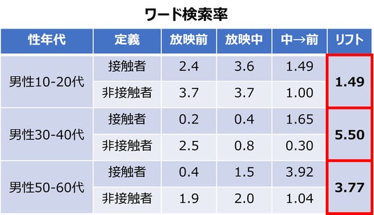 男性で検索行動が顕著だった点においては、放映商材の性質から興味・関心が比較的男性で高いと推測でき、広告接触によりさらに興味・関心を高めることに繋がったと考えられます。
