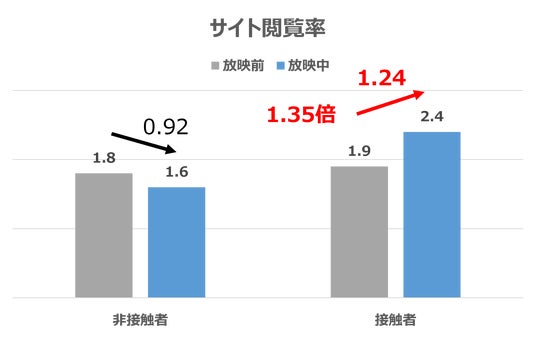 今回の調査結果からFamilyMartVisionの広告接触者/非接触者に関わらず、FamilyMartVision放映前から検索行動が生じていることから、一定程度の興味・関心はあったと推測します。その前提で、FamilyMartVision広告接触者は、放映前と比べて放映中の放映商材関連のワード検索率、サイト閲覧率ともに上昇しています。広告非接触は、放映前から中にかけてスコアが下がっており、接触者と非接触者のリフト差はワード検索率で2.05倍と高く、サイト閲覧率でも1.35倍になっており、検索行動への高い効果が確認できました。FamilyMartVisionの広告接触が商材の興味・関心を高め、放映前よりもさらなる検索行動に繋がったと考えられます。またワード検索/サイト閲覧も共にリフトしていることから、検索行動が単なるワード検索だけに留まらず、サイト閲覧までの一連のWeb上の行動を引き起こしたとも様子も窺えます。