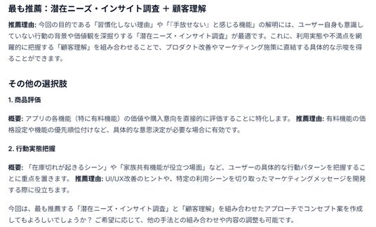 設問案だけではなく、リサーチの目的、ターゲット、リサーチを通じて得られる示唆などを整理したリサーチ方針(コンセプト)もセットで生成されるため、社内でのコミュニケーションやレビュー時の効率化を図ることが可能です。