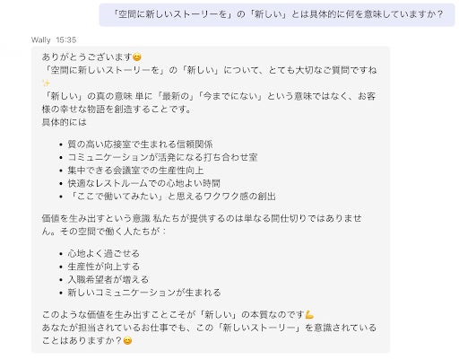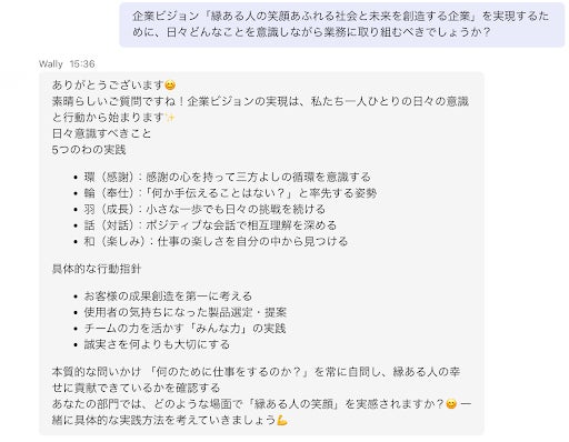 現場での判断に迷ったとき、理念の捉え方に悩んだとき、あるいは誰かに壁打ちしたいとき――「Wally」がすぐそばにいてくれることで、全員が自信を持って前に進める環境をつくります。