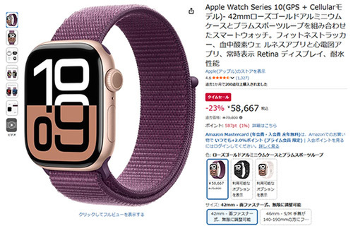 Appleのスマートウォッチ「Apple Watch Series 10(GPS+Cellularモデル)」が、Amazonタイムセール中に登場しました。過去価格75,800円から23%オフの58,667円で購入可能です。