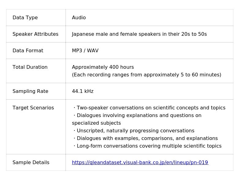Visual Bank Inc. (Minato-ku, Tokyo; CEO: Saneyuki Nagai; hereinafter “Visual Bank”) has launched the “Japanese Two-Speaker Science-Themed Conversational Speech Corpus Dataset” as part of its AI training data solution, Qlean Dataset, operated through its subsidiary Amana Images Inc.