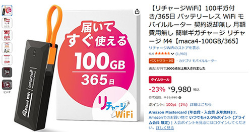 【Amazonタイムセール】モバイルルーター「リチャージWiFi M4(100GB/365日)」登場!