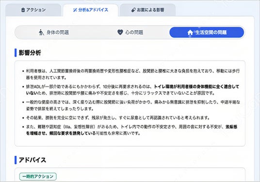 今回トライアル提供を開始する「教えて! 排泄ケア」は、「最近、失禁が増えたのはなぜだろう?」、「どんなケアをしたらいいか分からない」といった悩みに対し、服薬情報、既往歴、ADL(日常生活動作)の能力、排泄に関連する情報といった断片的な情報を統合的に分析し、課題の背景にある複数の要因を「影響分析&アドバイス」として網羅的に整理します。そして、具体的な対策を「アクション」として複数提案します。