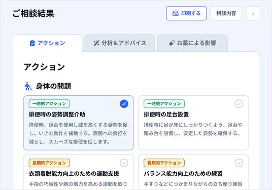 まず、食事や認知症ケアといった多様な領域に「相談機能」を拡張し、より深く多角的なデータ分析で、ベテランでも気づきにくいような専門的な示唆を提供します。