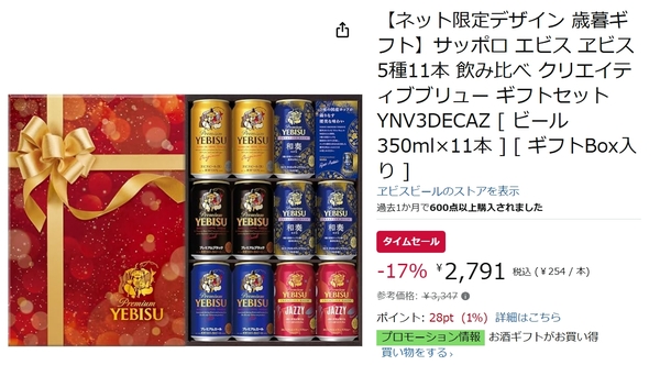 「【ネット限定デザイン 歳暮ギフト】サッポロ ヱビスビール5種11本飲み比べセット」がAmazonタイムセールに登場しています。