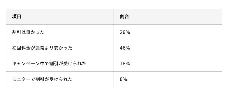 - 割引内容:「初回料金が通常より安かった」約半数(46%)