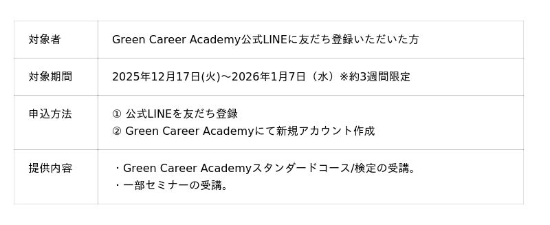 Green Career Academy公式LINEに友達登録いただいた方を対象に、2026年1月7日(水)まで無料で利用可能となるキャンペーンを実施中です。世界的に加速する脱炭素潮流に備えるため、誰もが“すぐに学べる・深く理解できる”新しいGX学習体験をお届けし、脱炭素スキルを「キャリアの武器に」にします。下記URL、QRコードよりLINE友達登録をお願いします。