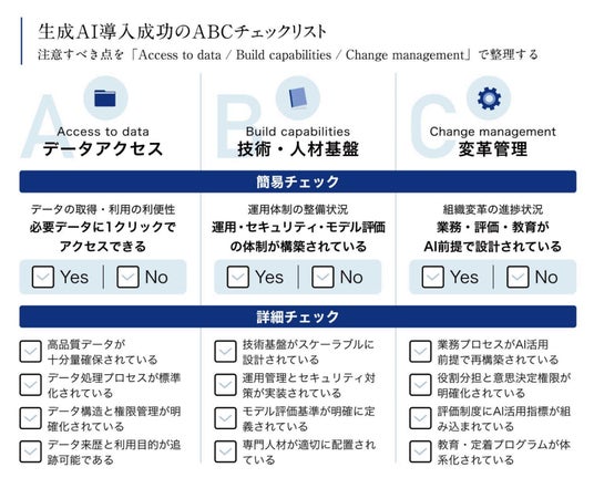 本レポートでは、生成AIが営業部門にもたらす具体的な活用事例や生成AI導入成功のチェックリスト(下図参照)などを用いながら、日本企業が直面する課題を乗り越えるための具体的な道筋を提示します。