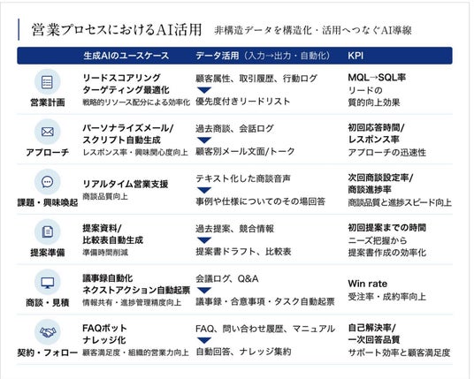 生成AIの進化が営業にもたらすのは、従前の効率改善の延長線上では捉えきれない質的変化です。個人の経験や勘に依存していた領域が可視化・再現され、効率の飛躍的な向上が期待されます。