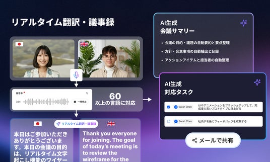 特徴的な機能:複数のAIモデルに議論させる「AIディベート」機能に加え、多言語対応のリアルタイム翻訳機能を搭載したAI議事録ツールも利用できます。