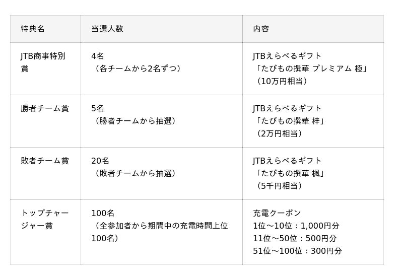 第2回となる今回は、新たにJTB商事を協賛パートナーに迎え、参加者は「温泉チーム」と「グルメチーム」に分かれ、充電時間を競い合います。参加者および勝者チーム、敗者チームの中から抽選で、最高10万円相当を含む総額60万円分の「JTB えらべるギフト『たびもの撰華』(旅行カタログギフト)」が29名に当たるほか、チームの勝敗にかかわらず、期間中の充電時間が上位100名には充電クーポンをプレゼントします。なお、本イベントの参加には、事前エントリーが必要です。