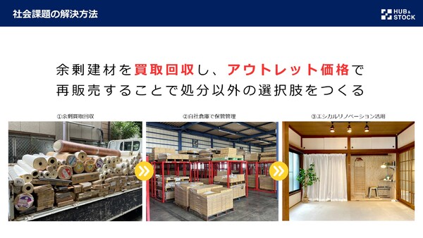 この課題については建材特化型のリユース市場が存在しないことが問題を深刻化させていると考え、HUB&STOCKでは余剰建材を買い取り・回収し、自社倉庫で保管・管理、そしてアウトレット価格で再販するビジネスモデルを立ち上げた。すでに、国内主要メーカーとの連携を進め、これまでに累計500トン以上の建築資材を循環させているところだ。