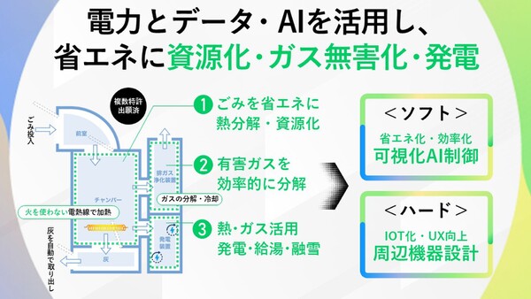 具体的には、液体・金属を除く可燃ごみ45L×20袋を5時間ほどで熱分解し、1~5%のバイオ炭や無機資源に減容しながら資源化する。熱分解するときに発生する有害ガスは効率的に分解・冷却して無害化し、発生熱は発電や給湯、融雪などへの活用にも今後繋げていく見込み。なお、5時間の使用で電気代は500円程度とのこと。排出される無機資源は建材や路盤材、アートなど材料にアップサイクル可能だ。