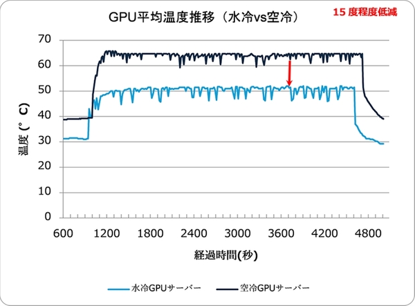 その結果、水冷GPUサーバーは空冷GPUサーバーと比べて、最大負荷時のGPU平均温度が15度(摂氏温度)程度抑制されたという。
