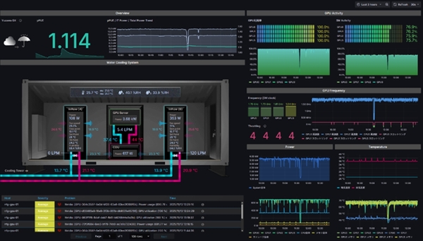 加えて、 水冷GPUサーバーを運用するコンテナ型データセンターにて、ラック間空調の制御やコンテナ内のキャッピング(熱を効率よく排出する仕組みや構造設計)を実施した上で、各種データを計測。コンテナ内のサーバールームの電力効率を示すpPUE(サーバールーム内の総消費電力/サーバールーム内のICT機器の消費電力)は「1.114」を記録した。