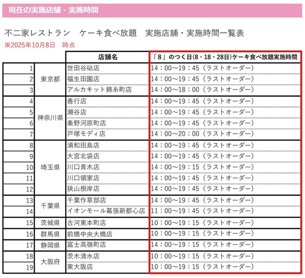 不二家ケーキ食べ放題はかつては対象店舗でほぼ毎日開催されていたところ、今年8月に全店舗いっせいに休止となり、10月から8のつく日(8・18日・28日)に開催という現在の形に切り替わりました。