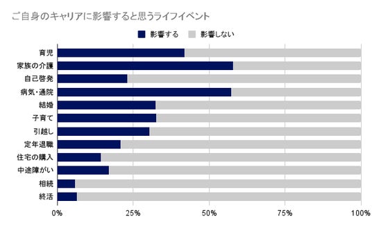 - 「キャリアに影響するライフイベント」では「家族の介護」が最も回答数が多い