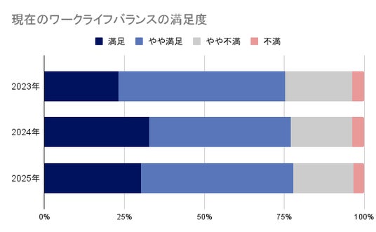- 「ワークライフバランス」に対する満足度で「満足」「やや満足」の合計が77.8%に達し、2023年の調査結果(75.1%)から増加
