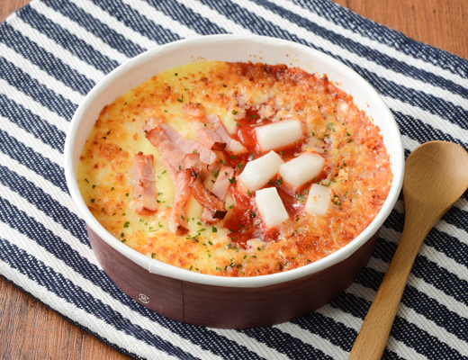 神戸元町ドリアで人気の「カルボナーラ風ドリア」と「BMTドリア(ベーコン・もち・トマト)」をハーフ&ハーフで仕立ています。1食362kcal。
