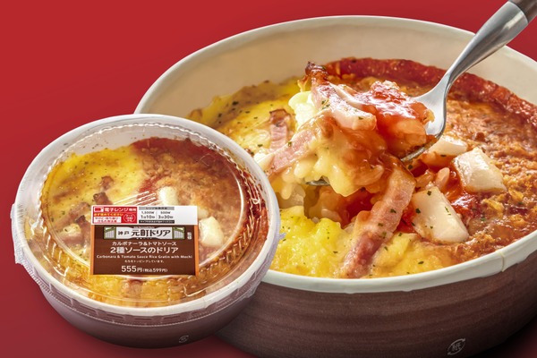 ドリア専門店「神戸元町ドリア」監修。カルボナーラとトマトソースの2つの味を一度に楽しめる商品です。
