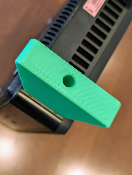 ここまでは、あくまで壁掛けから派生した方法での縦置きを探っていたが、そもそもの目的は、吸排気口をふさがずに縦置きできること。それなら、もっと直接的な方法があるということに気づいた。そう、直接「足」を作ってしまう方法だ。木片などを加工してもいいのだが、手元に3Dプリンターがあったのでこれを使って作ってみよう。