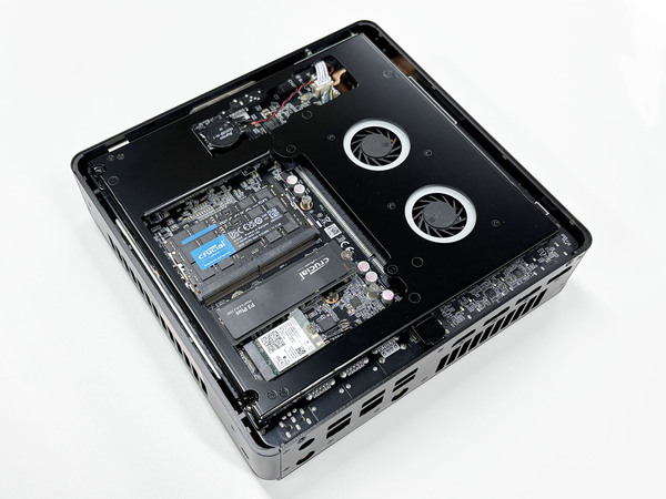 主なスペックは、CPUがCore Ultra 7 255HX、dGPUがGeForce RTX 5060 Ti(16GB)。メモリーは最高DDR5 6400に対応(SODIMM×2スロット、最大96GB)。SSD用として、PCIe5.0×4のM.2スロットを2つ装備している。