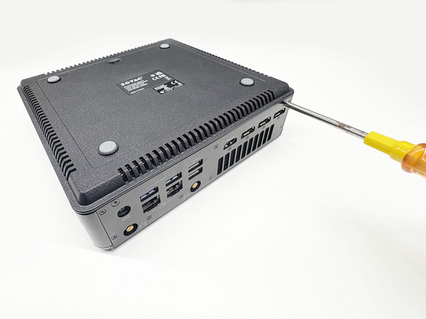 具体的な作業としては、背面2か所のネジを外し、底面を前方へとスライド。すると底面が外せ、メモリースロットとM.2スロットにアクセスできるようになる。