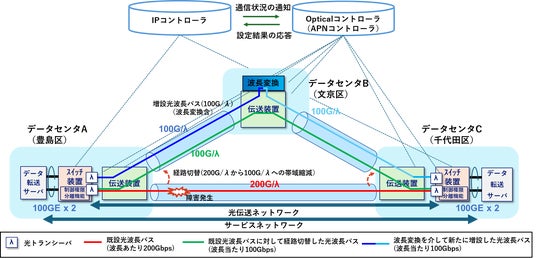 大学共同利用機関法人 情報・システム研究機構 国立情報学研究所(本所:東京都千代田区、所長:黒橋 禎夫、以下「NII」)、NTT株式会社(本社:東京都千代田区、代表取締役社長:島田 明、以下「NTT」)、NTT東日本株式会社(本社:東京都新宿区、代表取締役社長:澁谷 直樹、以下「NTT東日本」)は、激甚災害時のネットワーク維持を想定し、通信状況に応じて光伝送レイヤの設計・制御を自動化することで、波長変換を含む光波長パスにおける経路切替やオンデマンド追加設定を短時間で実現する技術の実証に、世界で初めて成功しました。本成果により、迅速な光波長パスの経路切替・追加提供が可能となり、先端技術研究を支える高信頼な通信基盤の実現と、その利便性の向上が期待されます。