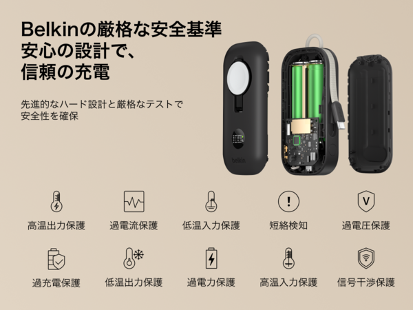 安全性については、Belkin SmartProtectによって温度や電圧・電流をしっかり管理しており、厳格なテストも実施。2年間の製品保証と、正しく接続された状態で充電中の電子機器が破損した場合は、最大28万円(2500ドル相当)を上限に当該機器を修理または交換する保証も備わっている。