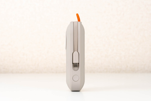 直付けのUSB-Cケーブルは編組ケーブルを採用して丈夫のため、断線の心配は少ない。本体側面に格納されるタイプで、持ち運び時にじゃまにならないのがいい。下にある丸いボタンは、バッテリー残量を表示するためのもの