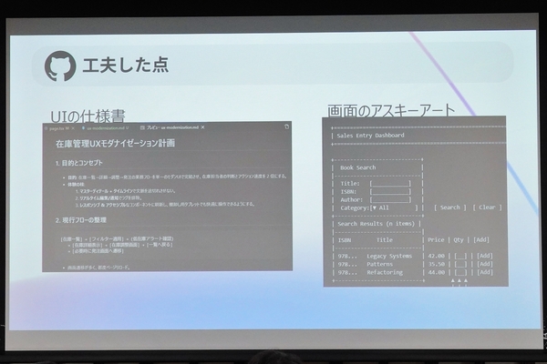 さらに、システムアーキテクチャや開発プロセスのモダナイズにおいては、GitHub Copilotにアーキテクチャ図をMermaid記法で書かせて、それを基に移行計画を立案。提供機能のモダナイズでは、Java5の動作確認が社内ルールでできなかったため、GitHub Copilotに画面UIを“アスキーアート”で表現させることで解決した。