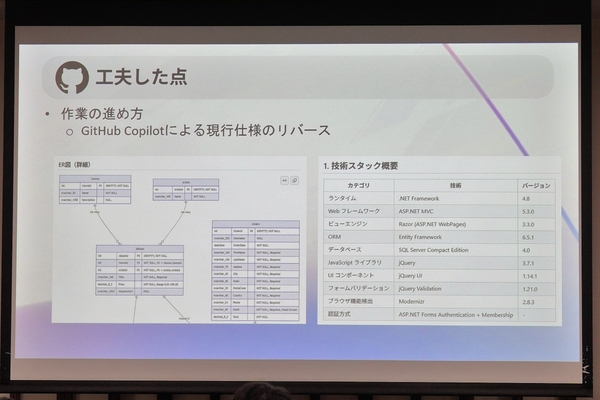 後半の実装では、Gitの同期ラグを最小限にするために「モブプログラミング」を採用。GitHub Copilotはドライバー、メンバーはナビゲーターという体制で、全員でソースコードを見ながら開発を進め、プルリクエストの作成、コードレビューなどもGitHub Copilotに任せている。今後の課題となったのは、「AI由来のソースコードの品質評価」だ。やはり知識がない中で、レビューしたり、潜在的な不具合を発見したりするのは時間を要したという。それでも、.NET Framework 4.8から.NET 10へのリビルドにこぎつけた。