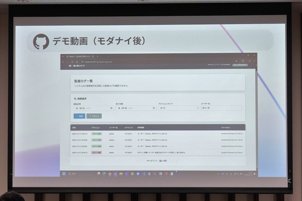 GitHub Copilot活用で工夫した点として、作業の分担後のシステムマージをGitHub Copilotに任せたのが効率化につながったこと、プロンプトにMarkdown記法を使用して精度を向上させたことが挙げられた。結果、JavaのアップグレードとUI改善までは達成するも、フロントエンドの分離は断念。ただ、UI改善では、管理者が監査ログを見られるこだわりの新機能を実装している。