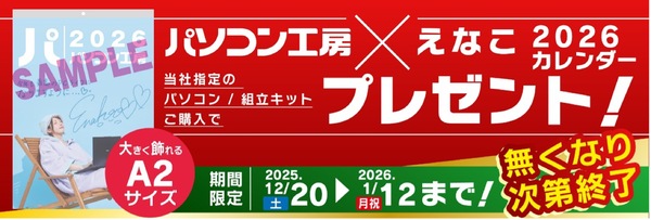 ユニットコムは、全国のパソコン工房店舗およびWEB通販サイトにて、「パソコン工房 × えなこ 2026 カレンダー」を先着でプレゼントするキャンペーンを12月20日から2026年1月12日まで開催する。本キャンペーンは、指定パソコンまたは組立キットを購入した人を対象に、合計1万枚のカレンダーを用意している。