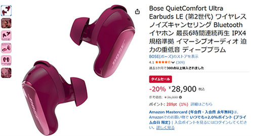 Bose(ボーズ)のワイヤレスイヤホン「QuietComfort Ultra Earbuds LE(第2世代)」が、Amazonタイムセールに登場しました。参考価格36,000円から20%オフの28,900円で販売中です。