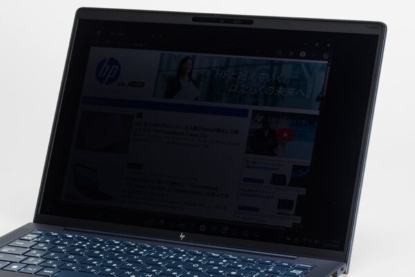 人目のある場所で作業する際、気になるのが画面の覗き見だ。「HP EliteBook」シリーズでは「HP Sure View」という覗き見防止機能を搭載したモデルを選択できる。この機能を利用すると、背後から画面をのぞき込んだとしても、ほとんど内容が判別できなくなる。やむをえず重要な資料を扱わなければならない場合でも、この機能があれば心強い。
